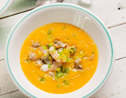 En el momento de comer, ponemos en platos hondos, le añadimos el aguacate, la cebolleta, los pimientos, los langostinos cortados en trozos y los berberechos. Riega con un chorrito de buen aceite de oliva y espolvorea con escamas de sal y a comer.